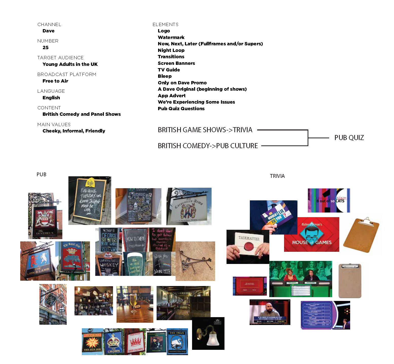 Dave is a niche British TV channel airing comedic factual programs and panel shows. British comedy is inseparable from pub culture- it's cheeky, social, and interactive.