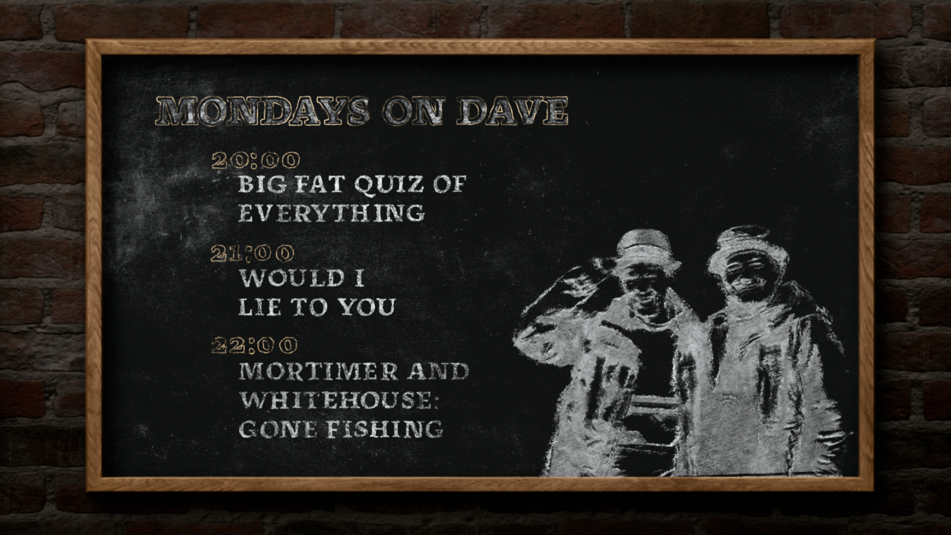 For the project, I created templates that transforms any image and live text into a chalk-like asset with ease. Beyond the standard TV branding elements, I designed channel-specific features, including an original bleep visual and a pop-up that lets viewers play along with Dave’s game shows.