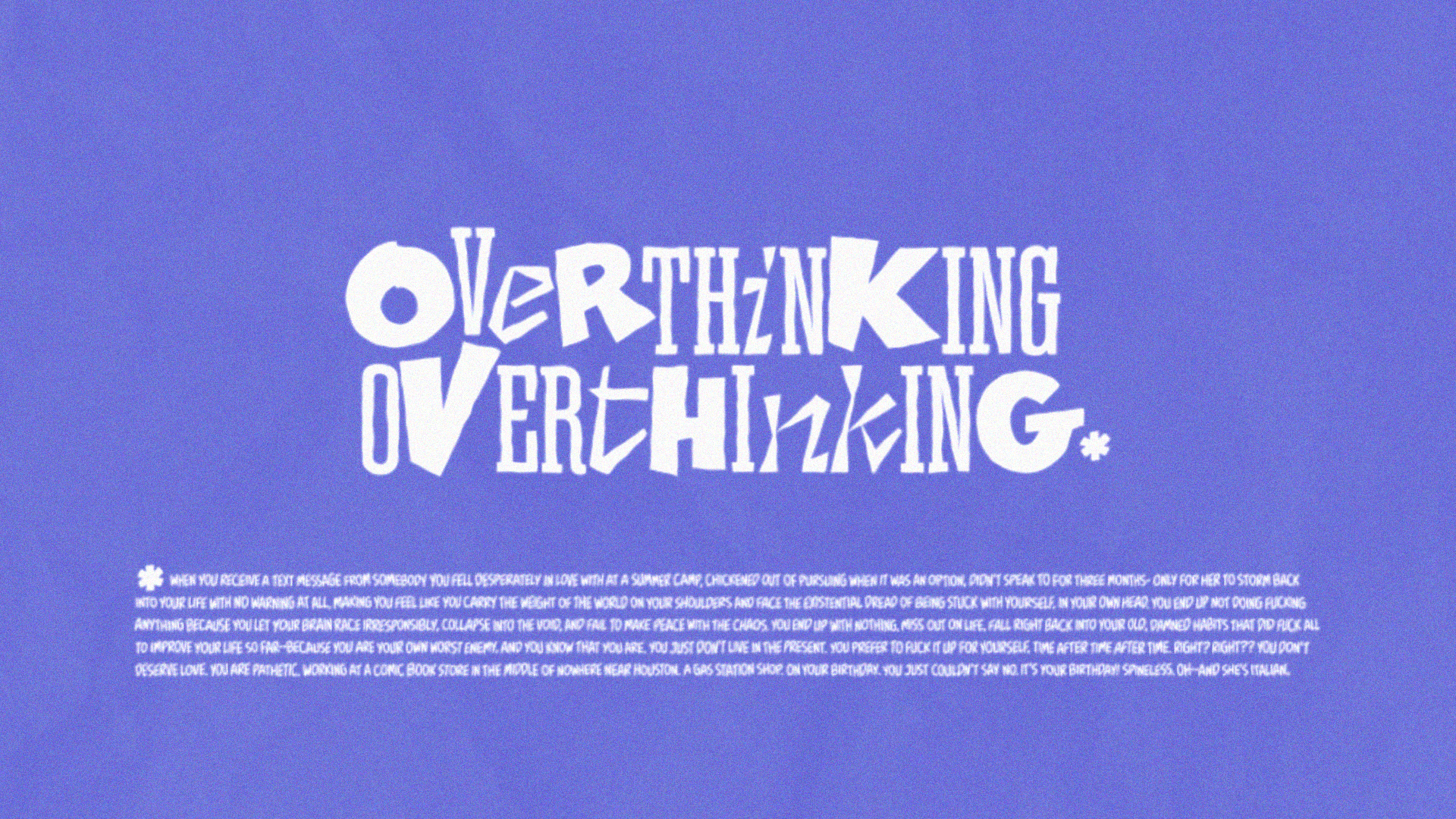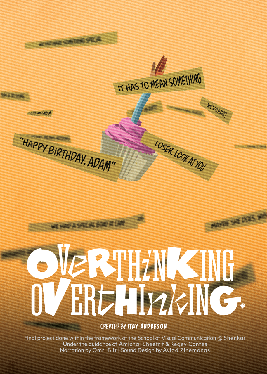 For my final project in Visual Communications at Shenkar- I adapted my original screenplay into a short mixed-media film. I wanted to highlight how getting lost in our thoughts can cause us to miss opportunities, and sometimes even life itself. My aim was to create a fun, humorous, and fast-paced viewing experience that rewards rewatching and makes viewers "feel" the rapid pace of our thoughts.